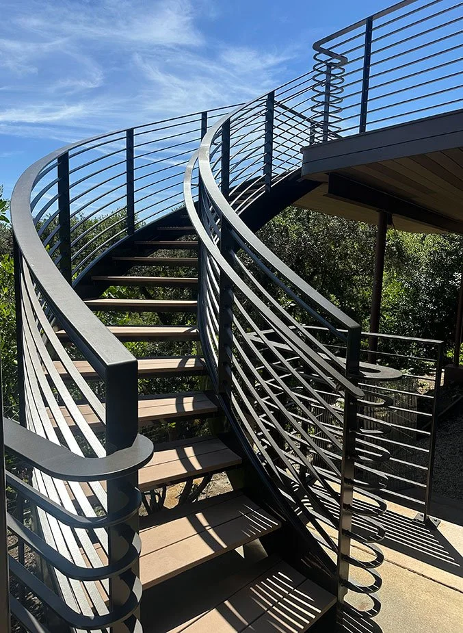 Steel Helix staircase. guardrail with solid steel bent the hard way. 14” steel bent stringers with wooden tread accent. Woodside, CA