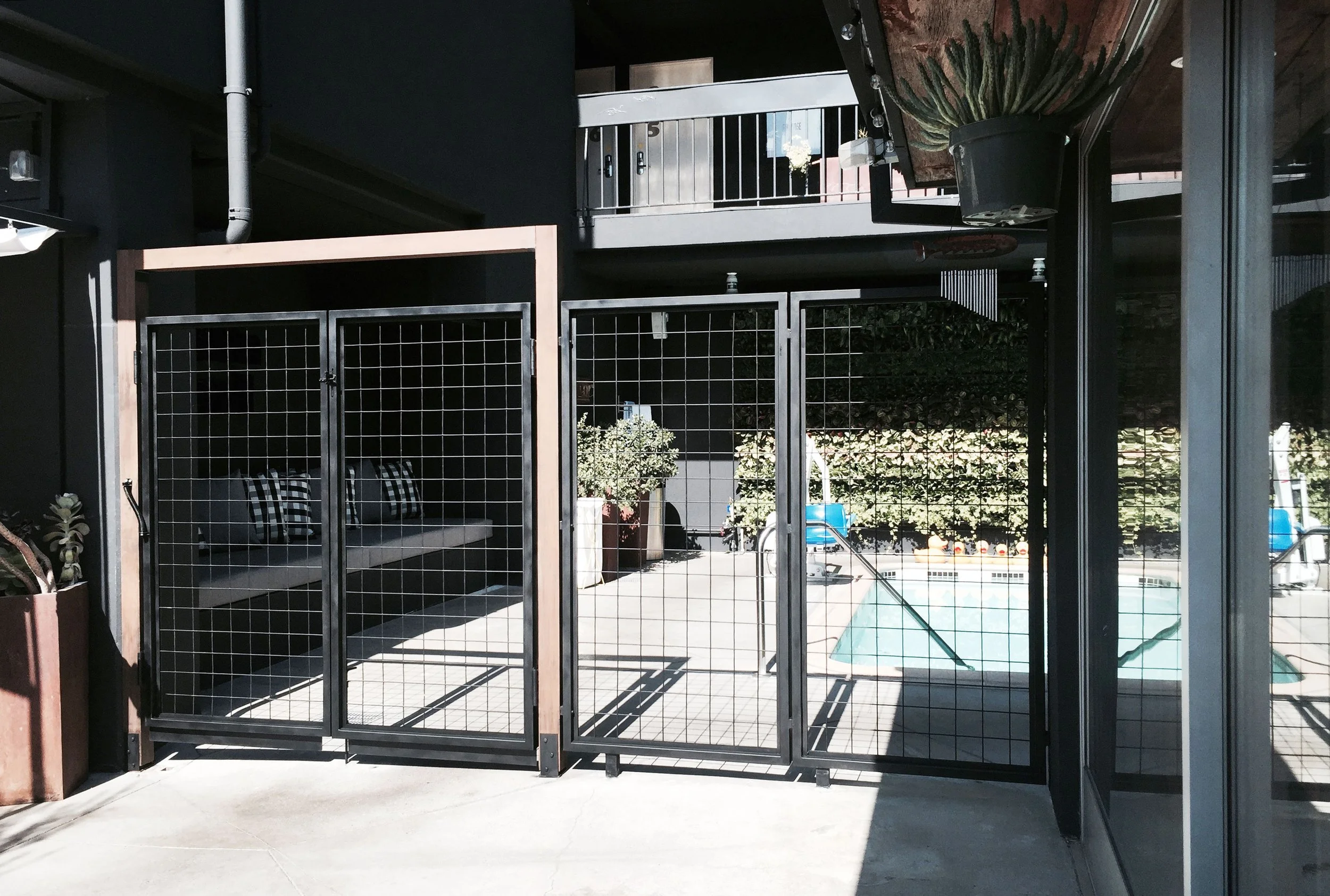 Pool Gate with Wood Beam and Expanded Metal, Farmer’s Daughter Hotel, Los Angeles, CA