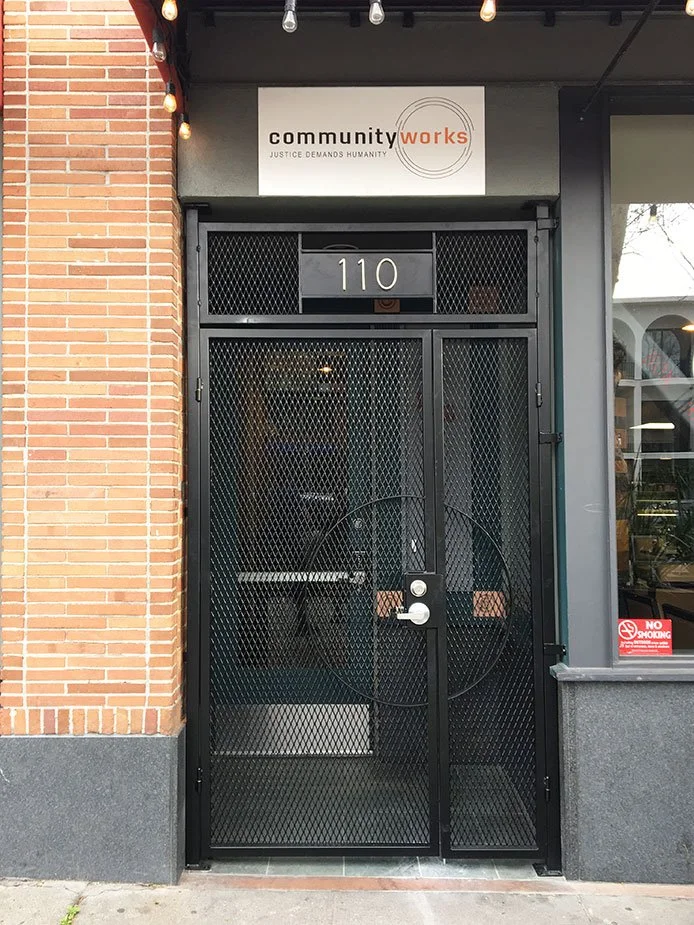 Bi-fold mesh with metal frame security doors. Black powder coating. Dolmas, Oakland, CA
