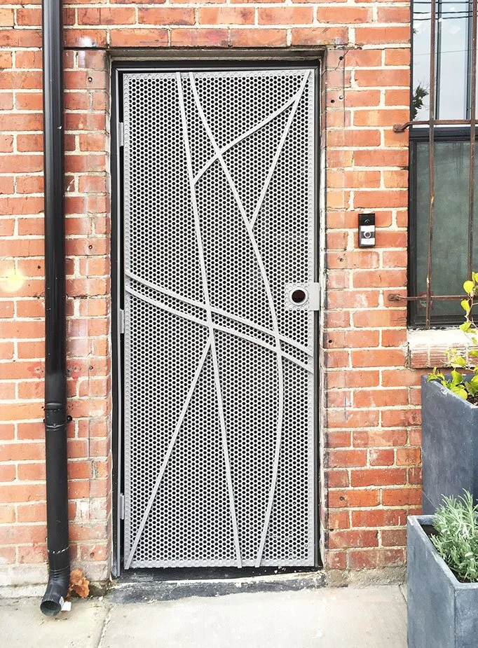 Bi-Fold door with topographical map design with circle mesh. Powder coated Gray. West Oakland, CA